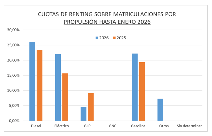 Por tipos de propulsión, en enero de 2026 se matricularon en renting 7.931 vehículos diesel, lo que representó el 33 % del total adquirido en renting. Los vehículos a gasolina registrados en renting fueron 14.214, el 59,2 % del total. La partida de coches eléctricos, a gas licuado de petróleo y a gas natural comprimido representó conjuntamente el 7,7 % del total en renting, hasta 1.849 vehículos. Dentro de este capítulo, los eléctricos fueron los más vendidos -1.724- y representaron el 7,2 % sobre el total de renting.