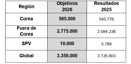 En 2026, Kia tiene como objetivo alcanzar unas ventas globales de 3.350.000 unidades. La marca espera vender 2.775.000 vehículos fuera de Corea y 565.000 en Corea. Kia también espera comercializar 10.000 vehículos para fines específicos en todo el mundo.