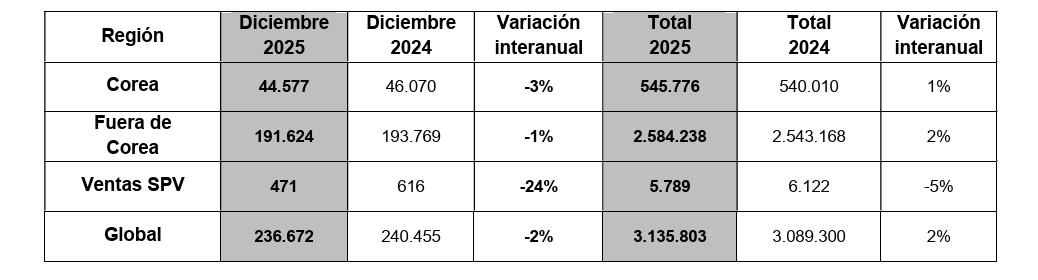 Madrid, 7 de enero de 2026. Kia Corporation ha anunciado hoy unas ventas globales de 3.135.803 vehículos en 2025, lo que constituye un nuevo récord anual global. Esta cifra supone un aumento del 2 % en comparación con el mismo periodo del año anterior.
